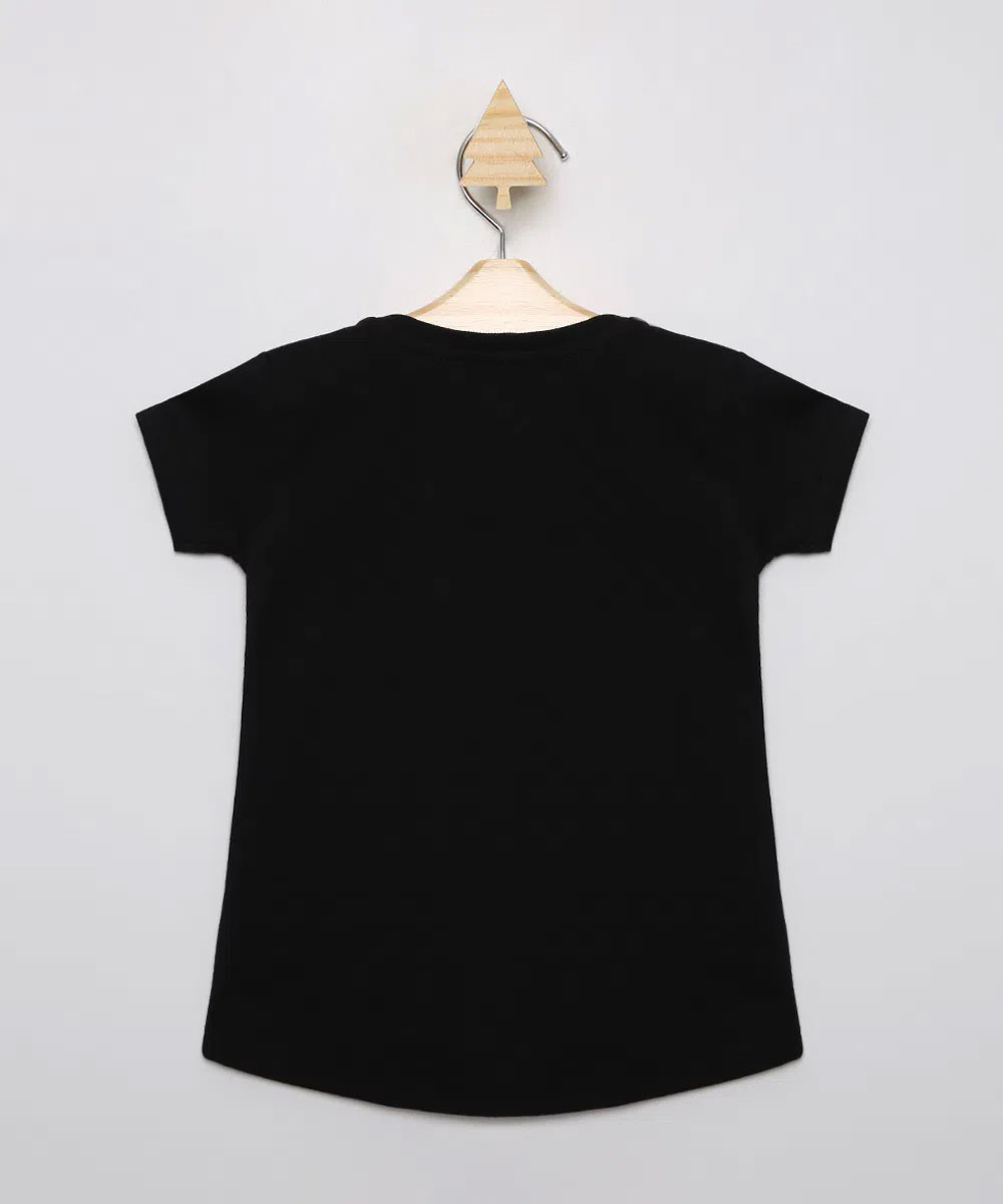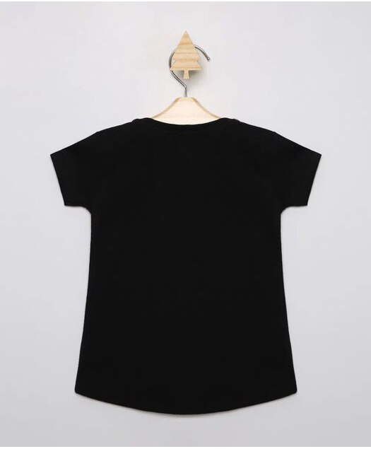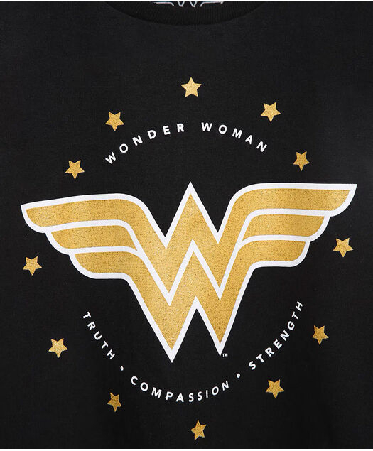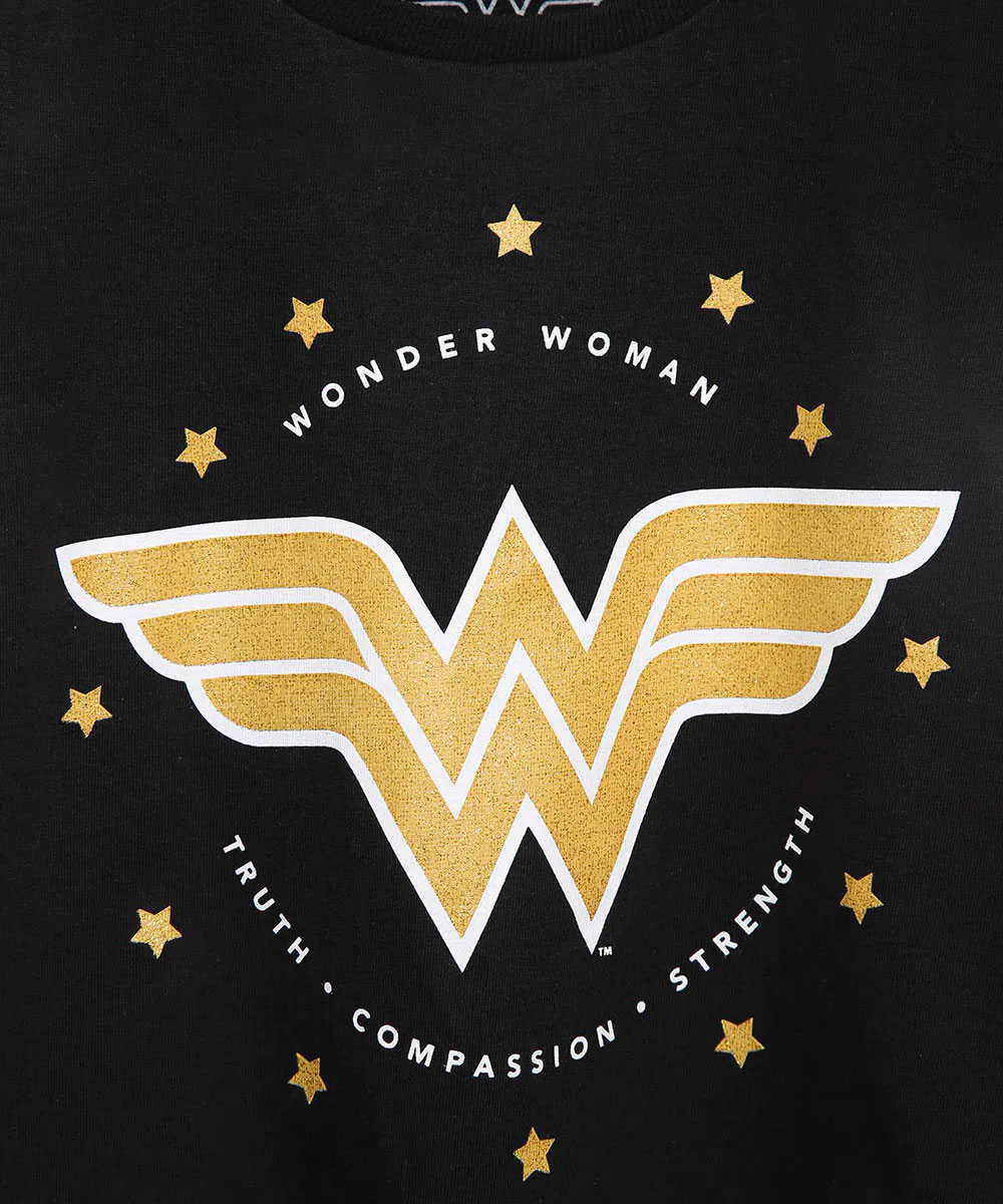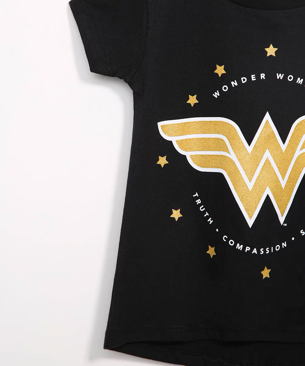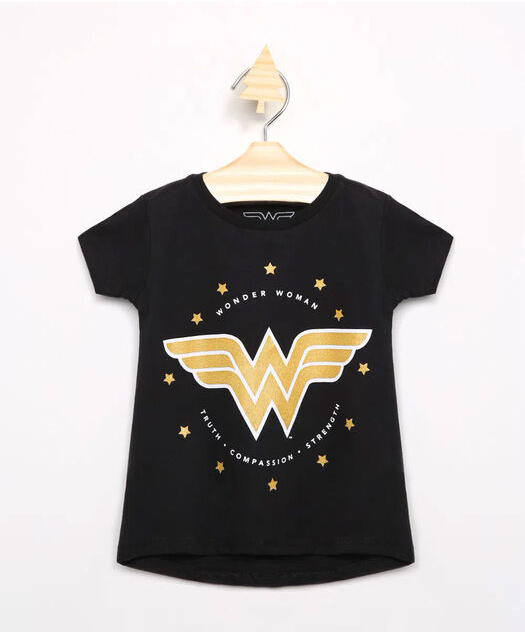 Descrição Blusa infantil feminina confeccionada em malha. O modelo é amplo com caimento soltinho e barra arredondada. O decote é redondo e as mangas são curtas. Possui estampa frontal da Mulher Maravilha com efeito metalizado.